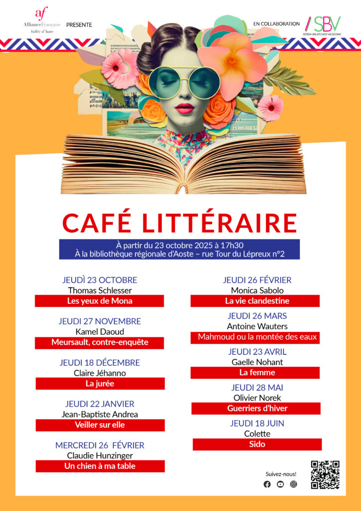 AOSTE – Fidèle à sa vocation de faire vivre la langue et la culture françaises au cœur de la Vallée d’Aoste, l’Alliance Française de la Vallée d’Aoste reprend, en collaboration avec la Bibliothèque Régionale Bruno Salvadori, son Café Littéraire pour la saison 2025-2026. Véritable rendez-vous de convivialité et de curiosité intellectuelle, ce cycle de rencontres mensuelles invite les amoureux des lettres à se réunir autour d’un ouvrage de la littérature française ou francophone, à en débattre, à partager leurs impressions et à faire dialoguer les sensibilités.